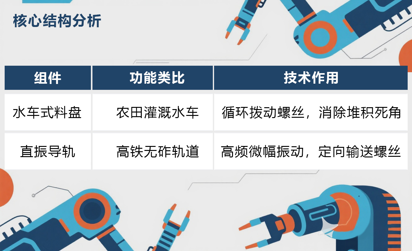 3.關(guān)鍵技術(shù)突破:垂直落料+水平雙向量振動(dòng)(傳統(tǒng)供料器僅單向振動(dòng)),使螺絲貼合導(dǎo)軌低摩擦滑移。